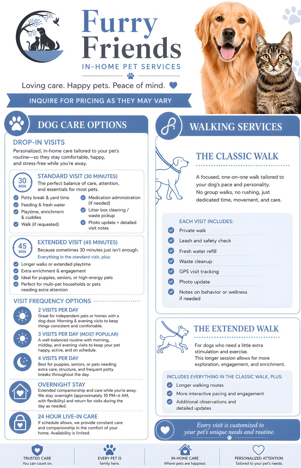 We stay overnight in your home so your pets can sleep in their own space with a familiar routine. They get companionship, potty breaks, feeding, and lots of comfort, while you get peace of mind knowing someone is there to keep them safe and cared for all night.